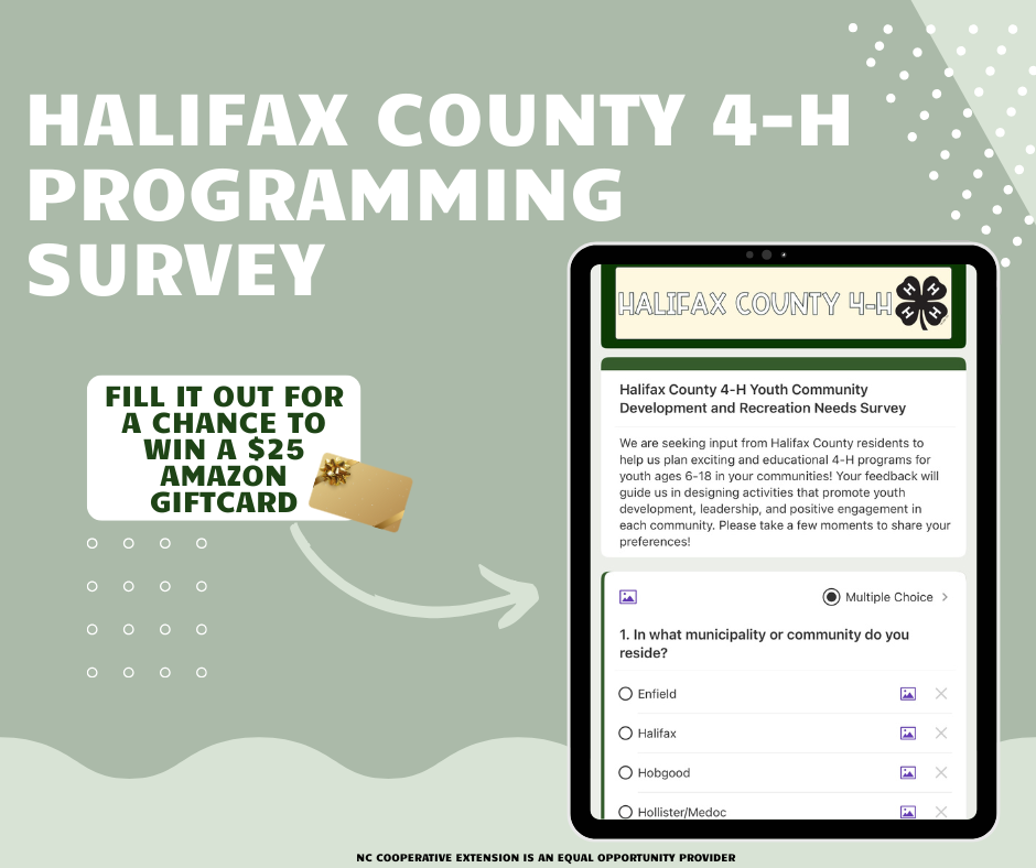 Halifax County 4-H is planning for 2026, and your input matters. Parents and guardians of youth in Halifax County, please take a few minutes to complete our quick 4-H Programming Survey and help guide us in offering programs that are engaging, low-cost, educational, and truly what our community wants. Your feedback will help shape future 4-H opportunities across the county. Thanks for helping point us in the right direction!