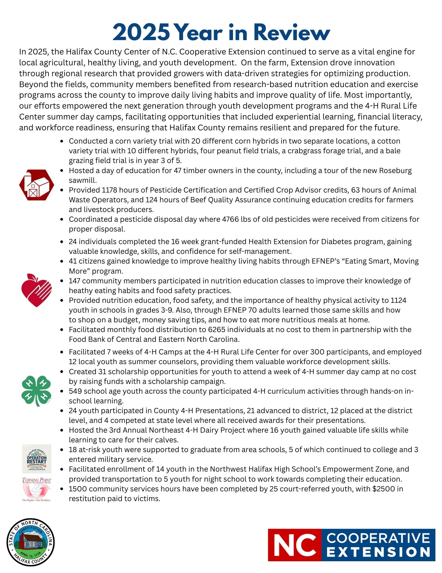 In 2025, the Halifax County Center of N.C. Cooperative Extension continued to serve as a vital engine for local agricultural, healthy living, and youth development. On the farm, Extension drove innovation through regional research that provided growers with data-driven strategies for optimizing production. Beyond the fields, community members benefited from research-based nutrition education and exercise programs across the county to improve daily living habits and improve quality of life. Most importantly, our efforts empowered the next generation through youth development programs and the 4-H Rural Life Center summer day camps, facilitating opportunities that included experiential learning, financial literacy, and workforce readiness, ensuring that Halifax County remains resilient and prepared for the future.