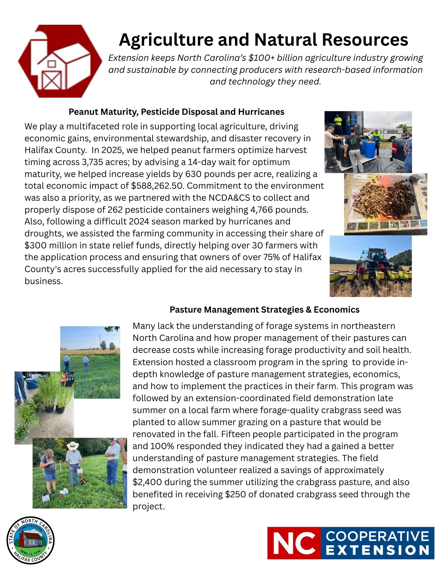 We play a multifaceted role in supporting local agriculture, driving economic gains, environmental stewardship, and disaster recovery in Halifax County. In 2025, we helped peanut farmers optimize harvest timing across 3,735 acres; by advising a 14-day wait for optimum maturity, we helped increase yields by 630 pounds per acre, realizing a total economic impact of $588,262.50. Commitment to the environment was also a priority, as we partnered with the NCDA&CS to collect and properly dispose of 262 pesticide containers weighing 4,766 pounds. Also, following a difficult 2024 season marked by hurricanes and droughts, we assisted the farming community in accessing their share of $300 million in state relief funds, directly helping over 30 farmers with the application process and ensuring that owners of over 75% of Halifax County’s acres successfully applied for the aid necessary to stay in business.