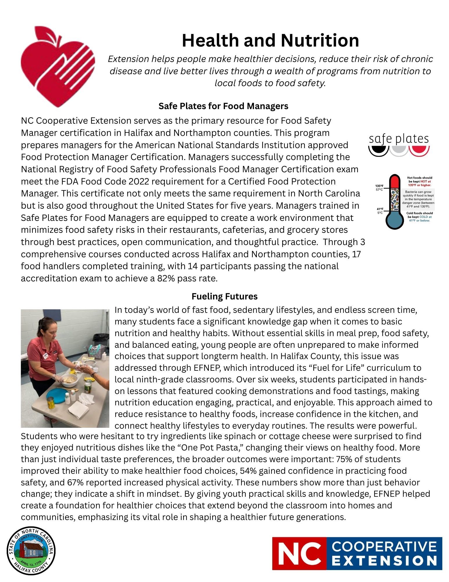 N.C. Cooperative Extension serves as the primary resource for Food Safety Manager certification in Halifax and Northampton counties. This program prepares managers for the American National Standards Institution approved Food Protection Manager Certification. Managers successfully completing the National Registry of Food Safety Professionals Food Manager Certification exam meet the FDA Food Code 2022 requirement for a Certified Food Protection Manager. This certificate not only meets the same requirement in North Carolina but is also good throughout the United States for five years. Managers trained in Safe Plates for Food Managers are equipped to create a work environment that minimizes food safety risks in their restaurants, cafeterias, and grocery stores through best practices, open communication, and thoughtful practice. Through 3 comprehensive courses conducted across Halifax and Northampton counties, 17 food handlers completed training, with 14 participants passing the national accreditation exam to achieve a 82% pass rate.