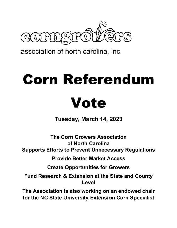 The Corn Growers Association of North Carolina will be conducting a referendum for the assessment of corn sold to first purchasers in North Carolina on March 14, 2023. Voting will take place at County Extension offices during regular business hours. The current assessment is 1.25 cents per bushel, and the Association is proposing to change the assessment to .30% of settlement. This will bring the Association’s assessment in line with other row crop assessments across North Carolina. If the Association realizes an increase in funds they will be applied to an endowed chair position at NC State University for the Extension Cropping Specialist-Corn position. This endowment will ensure the position will be filled with the highest qualified candidates in perpetuity. Additionally, any increase in revenue will cover the increased cost of conducting research which benefits all North Carolina corn producers. The votes will collected and tabulated by NC State University and results published by North Carolina Department of Agriculture & Consumer Services. The Corn Growers Association of North Carolina is governed by an all-volunteer board of farmers and industry representatives. The Association is committed to promoting production agriculture, funding research that benefits corn growers across the state, and