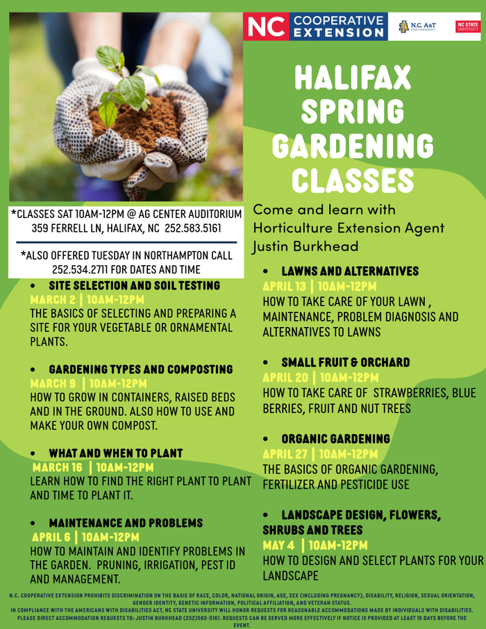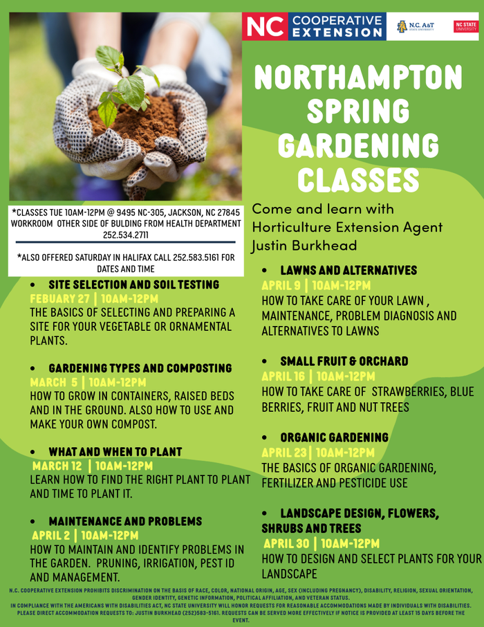 For accommodations requests due to disabilities, please direct communication to: Justin Burkhead 252.583.5161. Requests for reasonable accommodation made by individuals with disabilities should be made at least 15 days before the event.Northampton Spring Gardening Classes